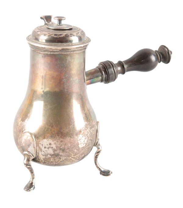 with French silver weevil import marks (1838-1864), of baluster form, the lid with hinged aperture for a molinet, on three legs with a wooden handle, 16.5cm high, 10 tr. ozs (handle removed)