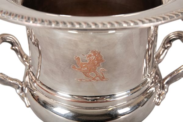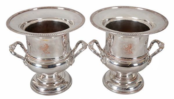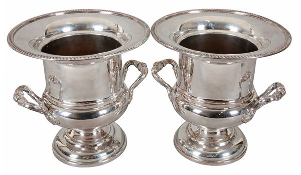 A PAIR OF VICTORIAN SILVER PLATED TWO HANDLED WINE COOLERS