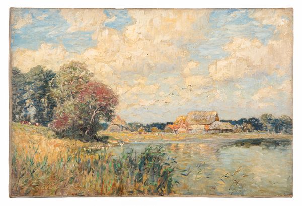 depicting a lake with a farm beyond, signed lower left, oil on canvas, 30.5cm x 46cm