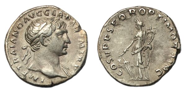 Denarius, Rome, laureate bust right, slight drapery, rev. Fortuna standing left, holding rudder set on ground and cornucopia, forepart of ship in background, 3.16g, (RSC 87, RIC II 122). Better than good very fine Provenance: from the Kent collection of Ancient coins