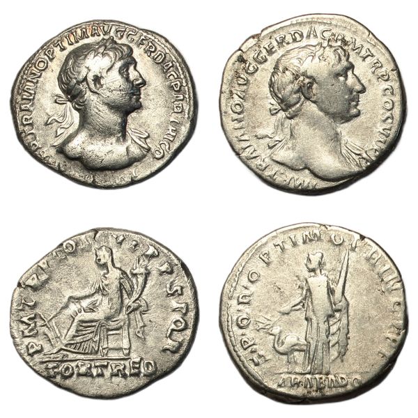 Denarii, Rome, laureate bust right, rev. Fortuna seated left on throne, holding rudder and cornucopia, (RSC 154b, RIC II 318); Rome, laureate bust right, slight drapery, Arabia standing left, holding branch and bundle of canes; at feet to left, camel standing left, ΛRΛB ΛDQ in exergue, (RSC 26, RIC II 245). Good fine Provenance: from the Kent collection of Ancient coins