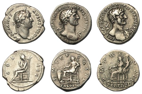 Denarii, Rome, laureate head right, rev. Pudicitia seated left on throne, (RSC 395a, RIC II 343); Rome, laureate head right, slight drapery, rev. Fortuna seated left, holding rudder on globe and cornucopia, (RSC 745, RIC 114); Rome, laureate bust, slight drapery, rev. Salus seated left, feeding snake coiled round altar, (RSC 1350, RIC 138). Good fine to very fine or better Provenance: from the Kent collection of Ancient coins