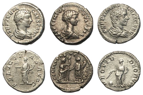 Denarii, all struck under Septimius Severus and Caracalla, Rome, draped bust right, rev. Felicitas standing left, holding short caduceus and cornucopia, (RSC 36, RIC IV 8); Laodicea ad Mare mint, draped bust right, rev. Felicitas standing right, holding long caduceus and clasping hands with Geta, standing left, holding cornucopia, (RSC 49, RIC IV 94); Rome, draped bust right, rev. Providentia standing left, holding wand and sceptre, globe on ground, (RSC 170, RIC IV 51). Good fine to very fine