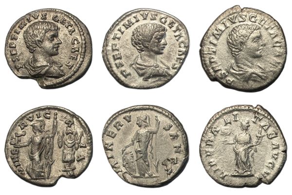 Denarii (3), Laodicea ad Mare, draped bust right, rev. Minerva standing, holding Victory and inverted spear, shield at feet, trophy to right, (RSC 88, RIC 104); Laodicea ad Mare, struck under Septimius Severus and Caracalla, laureate, and draped bust right, rev. Minerva standing left, resting hand on shield and holding inverted spear, (RSC 83a, RIC IV 105a var. (bust type)); as Caesar, Rome, draped bust right, rev. Liberalitas standing left, holding coin counter and cornucopia, (RSC 69, RIC 44). Very fine