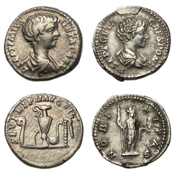 Denarii, Rome, struck under Septimius Severus and Caracalla, draped bust right, rev. emblems of the pontificate: lituus, secespita, guttus, simpulum and aspergillum, (RSC 188, RIC IV 3); Rome, struck under Septimius Severus and Caracalla, draped bust right, rev. Nobilitas standing right, holding sceptre and palladium, (RSC 90, RIC IV 13a). The first, good fine or better, the second, nearly extremely fine with a flan flaw at 12 o'clock