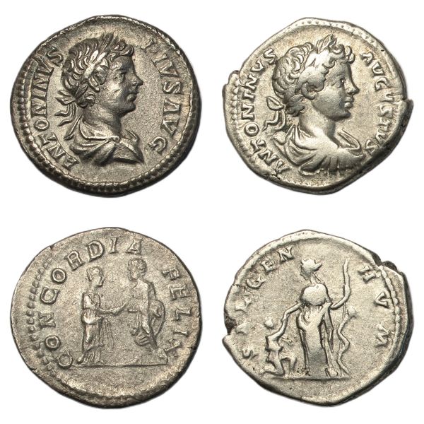 Denarii, Rome, laureate and draped bust right, rev. Plautilla and Caracalla standing facing each other and clasping hands, (RSC 23, RIC 124a); Rome, laureate and draped bust right, rev. Salus standing, extending right hand to man kneeling before her and holding serpent-entwined sceptre, (RSC 558, RIC 42c). The first attractive, nearly extremely fine, the second, nearly very fine