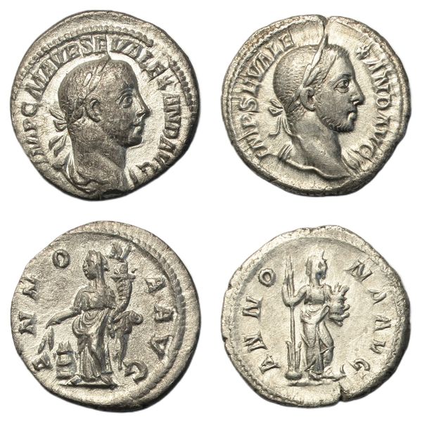 Denarii, Rome, laureate and draped bust right, rev. Annona standing holding grain ears over modius and cornucopiae, (RSC 23, RIC 133); Rome, laureate head right, rev. Annona standing holding rudder and modius with corn ears, (RSC 32 var. (without drapery), RIC 190). Good very fine Provenance: from the Kent collection of Ancient coins
