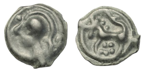 Potin, styalised helmeted head left, rev. horse with bifid tail left, rosette of five globules below, 3.36g, (LT. 7388-7392, DT. 150, CCCBM 1. 379-381). Extremely fine Provenance: from the Kent collection of Ancient coins