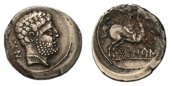 Denarius, bearded head right, Iberian letters BON behind, rev. Horseman right, holding spear, Iberian legend BOLSKAN below, 3.54g, (Abh-1911). Toned, very fine, reverse pitting to front of horse