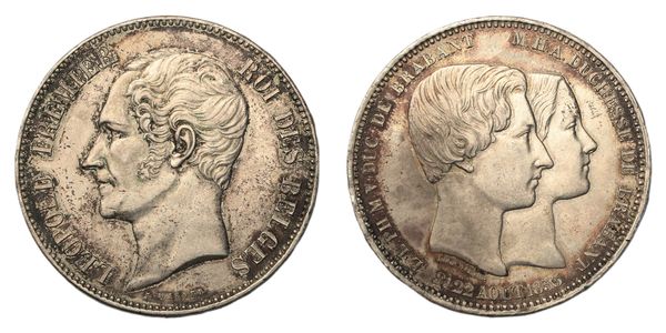 Commemorative 5-Francs for the marriage of the Duke, 1853, bare head left, rev. conjoined busts of the Duke and Duchess of Brabant, rectangular hyphen between 21 and 22 of date, 0.900 silver, (de M. 81, Dav. 52, KM. M8.1). Mottled toning, extremely fine