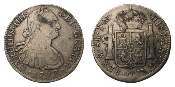 8 Reales, 1797, armored bust right, rev. crowned shield flanked by pillars with banner, 0.900 silver, 26.76g, (KM#109). Toned, residual to crown, fine/good fine