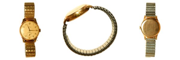 Smiths Deluxe, 9ct gold special presentation wristwatch, awarded in 1954 for 25 years service to H A Poulton 1924 - 1954. Replaced resofix expanding watch strap, 15mm. In working order, a few light scratches on glass. Face diameter, 30mm