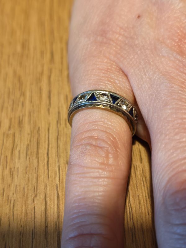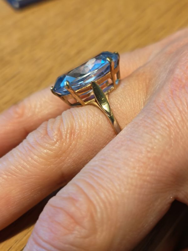 Four various gold rings; Gentlemans 9ct gold wedding ring with inset diamond, 5.7g, UK size V 1/2 Ladies, 9 carat, simulated Sapphire & simulated Diamond eternity ring, 4.5g, UK size J Ladies, 9 carat, blue topaz cocktail ring, hallmarked London 1968, weighing approximatley 22 carat, measuring approximatley 20x15 mm, 6.7g, UK size O Ladies, 18 carat, single round cut blue topaz, weighing approximatley 2 carat, measuring approximatley 9mm, 6g, UK Size 9 1/2