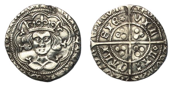 Groat, rosette-mascle issue, Calais, crowned facing bust, rev. long cross pattée, mm.cross patonce/plain cross, 2.85g, (SCBC 1859, N.1446). Clipped, previously cleaned, otherwise good portait, very fine