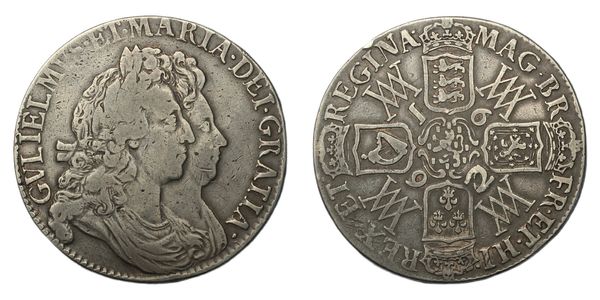Crown, 1692, 2 over inverted 2, conjoined laureate and draped busts right, rev. crowned cruciform shields, WM monogram and date in angles, edge QVINTO, (SCBC 3433, ESC 85, Bull 824). Deep rich toning, fine