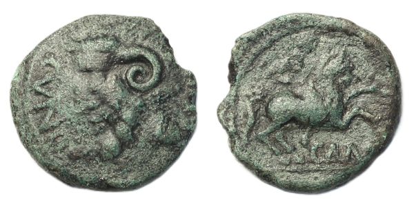 Cunobelin bronze unit, Jupiter warrior type, bearded head of Jupiter Ammon left, CVNO before, rev. warrior on horse galloping right, CAM below, 2.01g, (SCBC 345, ABC 2978). Fine and scarce