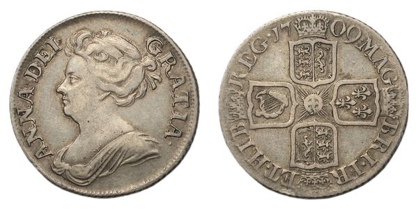 Shilling, 1709, post union, third draped bust left, rev. crowned cruciform shields, (SCBC 3610, ESC 1154, Bull 1402). Underlying mint sheen to obverse, about very fine