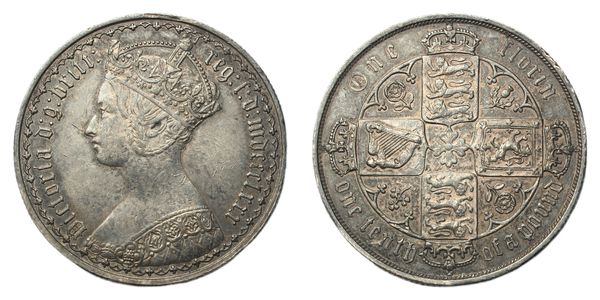 Florin, 1880, gothic type B8, crowned bust left, rev. crowned cruciform shields, emblems in angles, border of 34 arcs, (SCBC 3900, ESC. 854, Bull 2900). Piercing to edge at 12 o'clock, the surface exhibits an irregular dark tone, good very fine