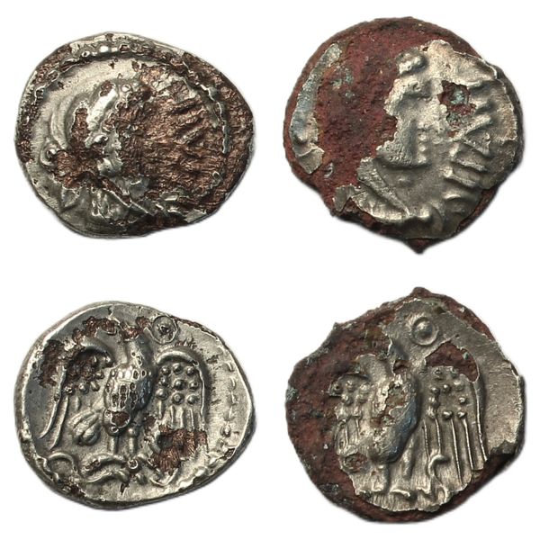 Epaticcus (20-40AD) silver plated units, Epaticcus eagle type, head of Hercules right, rev. eagle on snake, (SCBC 356, ABC 1346). Silver plating worn away but easily identifiable Provenance: The first found in Tangmere, Sussex, the second near Gravesend, Kent and both from the Kent collection of Ancient coins