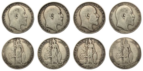 Florin, 1902, 1903, 1904 and 1909, bare head right, rev. Britannia standing, date below, (SCBC 3981, ESC 919, 921, 922, 927, Bull 3577, 3579, 3580, 3585). Fine