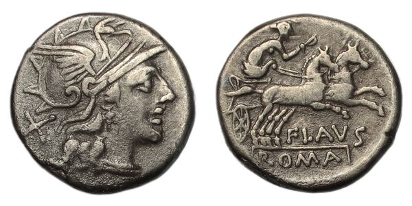 Denarius, head of Roma right, mark of value behind, rev. Diana in biga right, FLAVS below, ROMA in exergue, 3.78g, (Crawford 207/1). About very fine Provenance: from the Kent collection of Ancient coins