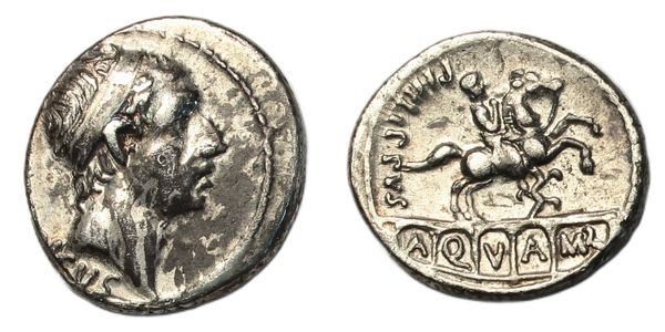 Denarius, diademed bust of Ancus Marcius right, ancvs below, rev. equestrian statue right on aqueduct, flower below horse, philippvs left, aqvamar within arches, 3.94g, (Crawford 425/1). Obverse a little off-centre, otherwise extremely fine