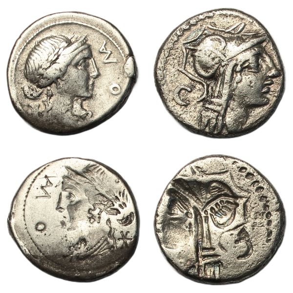 Aemilius Lepidus (114-113 BC), head of Roma right, ROMA before, XVI monogram behind, rev. incuse brockage of obverse, (Crawford 291/1); Junius Silanus (92 BC)?, head of Roma right, rev. incuse brockage of obverse. Nearly very fine and very rare Provenance: from the Kent collection of Ancient coins