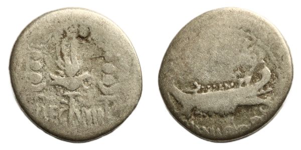 Denarius, Legionary galley sailing left, rev. legionary eagle between two standards, 3.01g, (Cr. 544/21). Fair